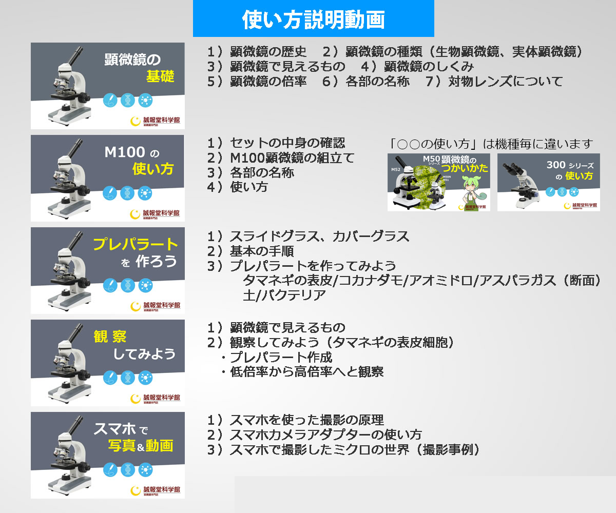 顕微鏡を購入しても十分に活用されていないケースが殆どです。顕微鏡は正しく使えば観察は簡単ですが、何も知らずに使おうとすると全く何も見えずすぐに飽きてしまいます。ご家族の方が使い方の説明・指導をするもの敷居が高いでしょう。当店ではこのような実情に鑑み、誰でも使いこなせることを目標として、「顕微鏡の使い方動画」(顕微鏡本体、及び、全セットに付属)を顕微鏡とセットにしてご提供させていただいています。今後も、より良くお使いいただくために、顕微鏡のメンテナンスや観察方法、その他の動画を継続的に補強していきます。