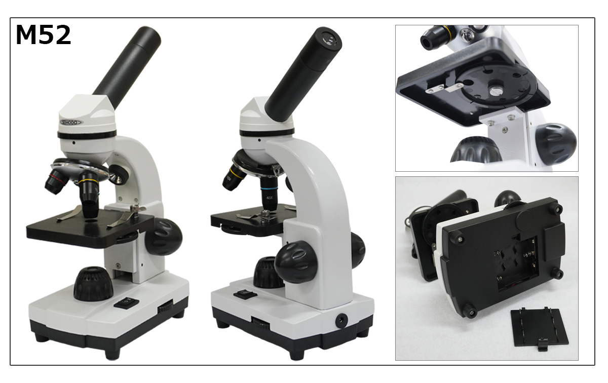 ③2つのモデルがあり、M52-E1は接眼レンズが1個(10x)で、40倍、100倍、400倍で観察できます。M52-E2は接眼レンズが2個(10x,16x)で、10x接眼レンズう使えば40x, 100x, 400xで、16x接眼レンズを使えば64x, 160x, 640xで観察できます。