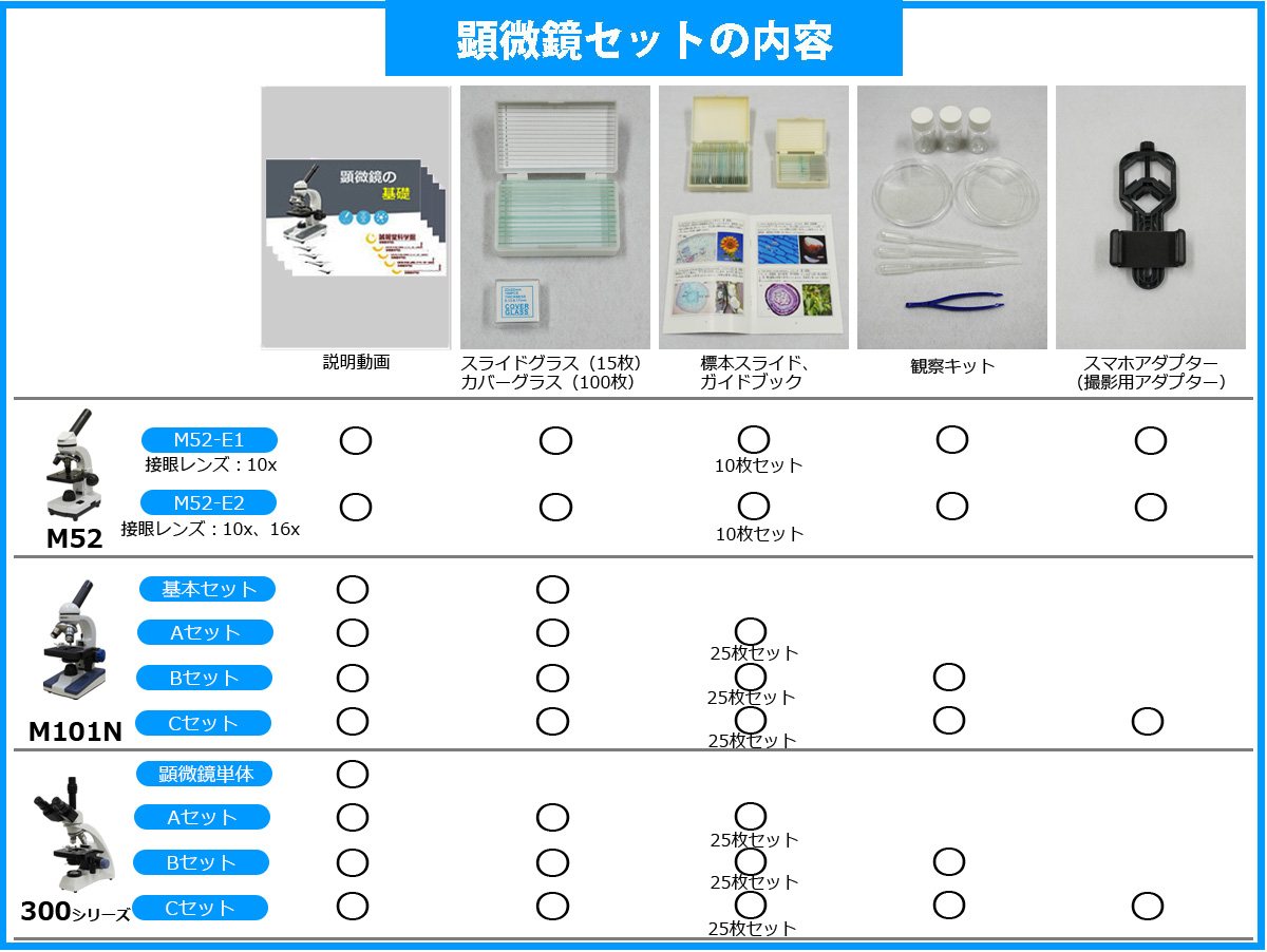 この顕微鏡セットは「子供の探求心と想像力を育てる」ことを目的としています。そのため、高性能な顕微鏡と、顕微鏡を使いこなすためのアイテムをセットにしたものです。顕微鏡には100シリーズ、200シリーズ、300シリーズの3種類の生物顕微鏡をご用意していますが、特に、①スポイトやペトリ皿などの観察セット、②ガイドブック付き標本プレパラート、③スマホカメラアダプタをセットにした「Cセット」が最も楽しんでいただけると考えています。また、それに加えて「使い方動画」をご用意しています。その他のセット(基本セット、Aセット、Bセット)でも使い方解説動画は共通でご準備しています。